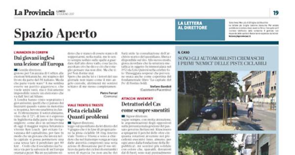 leggo sul quotidiano da lei diretto del 9 giugno che è in fase di progettazione la pista ciclabile 18 ring interno viale Trento e Trieste e sono a chiedere che nel frattempo venga avviata dalle autorità competenti una seria azione di dissuasione per il suo utilizzo da parte dei ciclisti di entrambi i sensi di marcia (se non anche dei marciapiedi) e che lo stesso venga fatto per via Dante e Porta Venezia dove ancora molti non usano le ciclabili con gravi rischi per gli automobilisti.