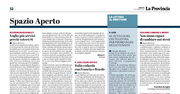 alcuni lettori opinionisti hanno espresso l’intenzione di votare per il No al referendum per l’autonomia della Lombardia del 22.10.2017. Lo scrivente, i miei familiari e molti nostri amici e conoscenti voteremo invece per il Sì . Onore ai 50 sindaci della nostra provincia che hanno costituito il comitato per il Sì, tristezza e delusione invece per quelli che voteranno per il No ubbidendo a stupide e stantie logiche di partito e non al benessere dei cittadini della loro regione. In nome della par condicio chiedo cortesemente di elencare anch’io alcune ragioni del Sì. (1) Vogliamo che le tasse dei lombardi restino in Lombardia. (2) Stop al travaso di 54 miliardi di euro dei lombardi nello spreco statale. (3) Bloccare l’idrovora centralista che succhia ben l’83% dei soldi ai lombardi. (4) Vogliamo più servizi, più assistenza, più strade, più sanità pagando meno tasse. (5) Vogliamo una risposta vera alla crisi economica, con più posti di lavoro e meno imposte. Ricordo a gli amici lettori che il residuo fiscale della Lombardia (differenza tra le tasse pagate e la spesa pubblica complessiva ricevuta) è di 54 miliardi di euro all’anno, più della Liguria, dell’Umbria, delle Marche, del Lazio, della Toscana, del Piemonte e dell’Emilia Romagna messe insieme.