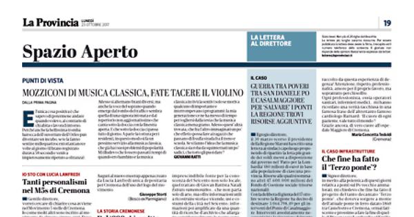 nell’articolo che domenica scorsa su ‘La Provincia’ segnalava l’apertura di una mostra documentaria sul Seicento cremonese in Palazzo Comunale, nel Salone degli Alabardieri, mi è toccato leggere: ‘Si inizia a ri-considerare il XVII secolo e chissà che sia la volta buona per l’avvio di studi seri e costruiti sulle fonti per rileggere un periodo importante della storia, non solo cremonese’. Vorrei far umilmente osservare che ‘studi seri costruiti sulle fonti’ già abbondano nell’ambito della storiografia locale e sono scritti da colleghi e colleghe specialisti del settore. Per quanto mi riguarda – non dovrei essere io a dirlo, ma la cosa è sfuggita ai più – cito la corposa pubblicazione presentata il 1° giugno del 2016 edita congiuntamente dalla Biblioteca Statale di Cremona e dalla Biblioteca Apostolica Vaticana. Si tratta di una nuova imprescindibile fonte per la conoscenza del Seicento non solo locale, quel trattato di Giovan Battista Natali Estrato ramemorativo... che non parla solo di arte, ma offre informazioni utili a ricostruire storia e vicende, usi e costumi della città nel Seicento; informazioni poi amplificate da una quantità di ricerche d’archivio che allargano considerevolmente le nostre conoscenze sul XVII secolo. Creda, direttore, del Seicento si è scritto e si scrive. Il vero problema è che non si legge.