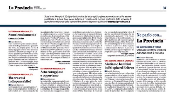 se il buongiorno si vede dal mattino, l’inizio non è dei più felici. Mi riferisco al referendum per l'autonomia che si è tenuto domenica 22 ottobre. Non capisco perché non c’era bisogno del quorum per l’esito del voto ! Se solo un risicato 40% ha reso valido il voto era così necessario votare? Se poi c’è pure un voto contrario al 5% e un voto nullo al 1,5%, era così primario recarsi alle urne? Ma in momenti così difficili era necessario spendere 50 milioni di euro per una farsa? Se la Lombardia con le sue specialità produce benessere e consente ad altre regioni la sopravvivenza aveva bisogno di gettare all’aria 50 milioni di euro? Perché in Veneto si è raggiunto il quorum? Perché con il voto così tecnologico i risultati sono arrivati dopo 20 ore? Perché ai seggi con il voto tecnologico c’erano gli stessi scrutatori? Il futuro dei tablet quale sarà? Se come ho letto 23.000 tablet sono costati 24 milioni di euro, questi tablet non sono un po’ cari? Era possibile un tavolo di intenti con il governo per raggiungere un accordo? Maroni perché rifiuta lo statuto speciale?