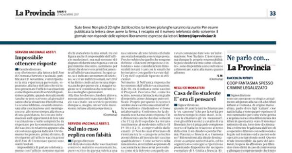 con riferimento alla lettera dell’Asst di Cremona Servizio vaccinale, pubblicata il 21 novembre, vorrei riportare la mia esperienza personale, soprattutto alla luce del fatto che si è inteso presentare l’ufficio vaccinazioni come dispensatore di servizi di qualità ineccepibile, quando in realtà molti (anche se non scrivono al giornale) sanno che la situazione è ben diversa.