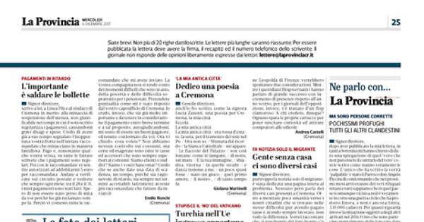 purtroppo fa notizia solo il migrante: è stata dedicata una pagina intera al problema. Nessuno però parla dei diversi casi presenti a Cremona. Oltre a mostrare poca umanità verso i nostri cittadini che si trovano nelle stesse difficoltà pur avendo pagato tasse e avendo sempre lavorato, non vedo la differenza. Vorrei raccontare che al parcheggio del foro boario c’è un furgone in sosta sotto l’occhio vigile delle istituzioni tutto coperto da giornali dentro al quale vive un italiano. A voi, istituzioni e non, le conclusioni.