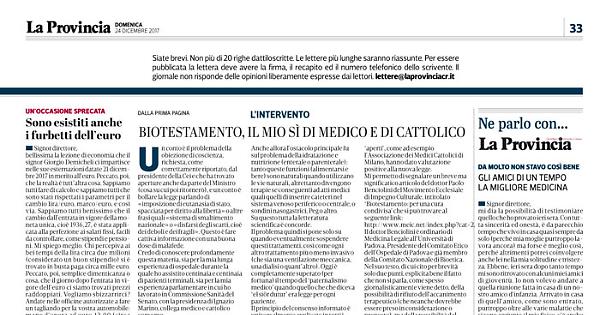 Mi permetto di segnalare un breve ma significatico articolo del dottor Paolo Benciolini del Movimento Ecclesiale di Impegno Culturale, intitolato ‘Biotestamento: per una cura condivisa’ che si può trovare al seguente link: http://www.meic.net/index.php?cat=2.