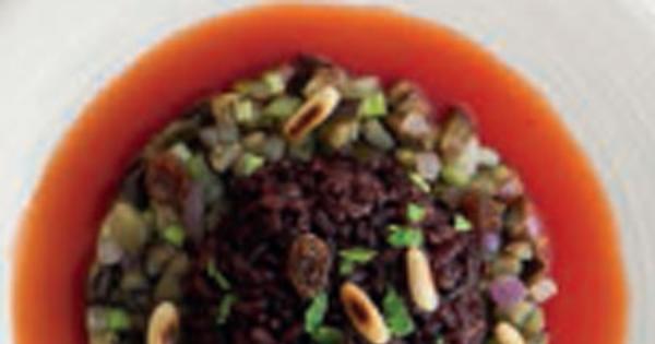 Ingredienti (per 4 persone): 2 melanzane, 1 gambo di sedano, 50 g di pino, 50 g di uvetta, 500 g pomodori maturi, 1 cipolla, 2 cucchiai di aceto, 20 olive di Nocellara, 300 g riso Venere, 2 cucchiai di zucchero, basilico, olio esxtravergine di oliva, sale.