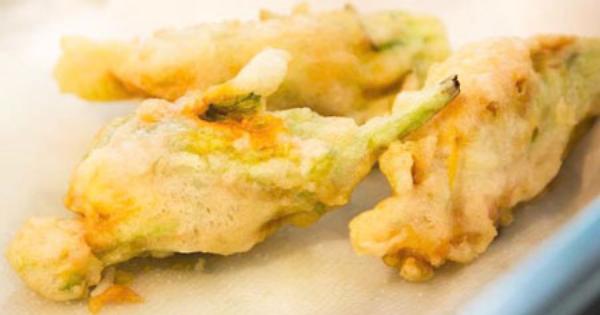 Ingredienti (per 4 persone): 6 tuorli d'uovo, 50 g pecorino stagionato, 20 g di guanciale cotto, 220 g farina 00, 110 g farina di riso, 500 ml di birra, 4 fiori di zucchina grandi, pepe macinato grosso, acqua di cottura del guanciale, acqua frizzante, olio per friggere.