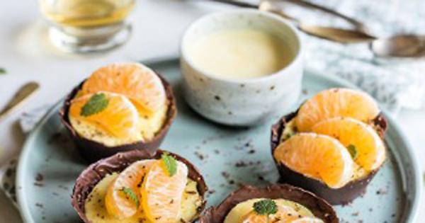 Ammorbidire i fogli di gelatina in acqua fredda. Poi sciogliere a bagnomaria in un tegamino il cioccolato tagliato a scaglie. Spennellare sei formine di silicone prima con l’olio di mandorle e poi tre-quattro volte col cioccolato fuso, fino a ottenere uno spessore di 2 mm. Far rassodare il cioccolato negli stampini, mettendoli in frigo per mezz’ora. In un tegame scaldare per 10 minuti a fiamma bassa la buccia grattugiata dei mandarini, il loro succo e il Grand Marnier (facoltativo). In una casseruola montare i tuorli con lo zucchero, diluire il composto con il succo caldo dei mandarini, mescolare, porre sul fuoco e togliere appena raggiunge il bollore. Incorporare la gelatina strizzata e fate raffreddare. Unire al composto la panna montata.Rovesciare le formine sul piatto da portata, premendole sul fondo. Riempir i cestini con la mousse, guarnir con uno spicchio di mandarino e scagliette di cioccolato. Conservar in frigorifero fino al momento di servire.