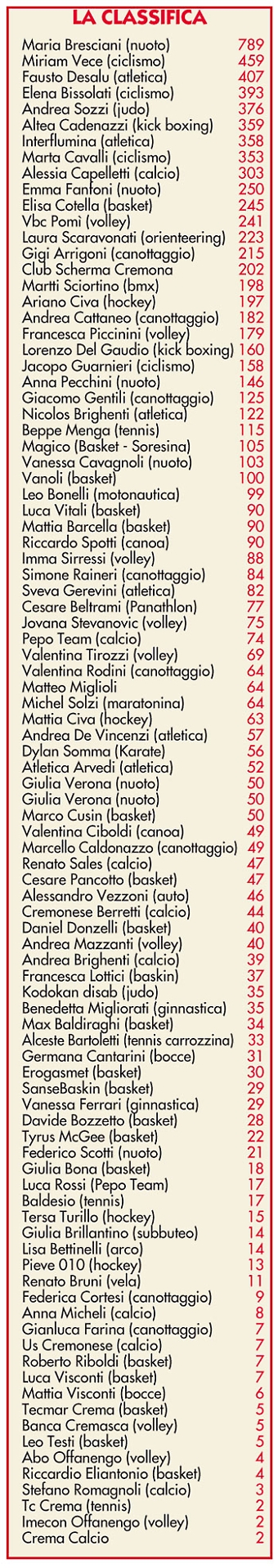 I più votati — In assoluto Maria Bresciani (nuoto disabili) della società Delfini di Cremona ha ottenuto il maggior numero di voti. Maria gode di grande popolarità e, come lei stessa ha ammesso in una recente intervista, ha molti fans che la seguono proprio attraverso i vari social. Eccellente performance anche per Miriam Vece, ciclista di Romanengo, reduce da una eccellente stagione. Subito dopo, la freccia dell’atletica leggera: Fausto Desalu che con la sua Interflumina ha scalato anche la classifica della Nazionale.