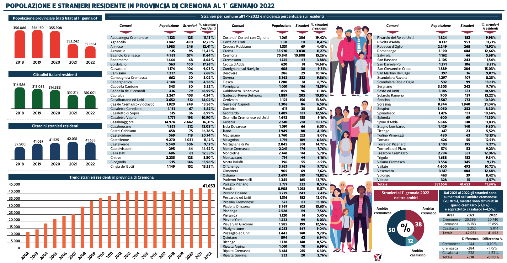 CREMONA - Diminuiscono i residenti, in generale; e calano anche gli stranieri, in particolare: consegna l’impressione di un territorio che viaggia verso un ridimensionamento anche demografico, il tradizionale report statistico redatto dalla Provincia. Nel dettaglio, al primo gennaio 2022 la popolazione risulta di 351.654 abitanti — 173.826 maschi (il 49%) e 177.828 femmine (il 51%) —, con un decremento rispetto all’anno precedente dello 0,2% (588 unità).