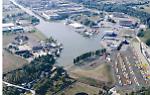 Una veduta dall’alto del porto canale. Nei riquadri, Maurizio Ferraroni, Marcello Parma, Stefano Trabucchi e Marco Bressanelli