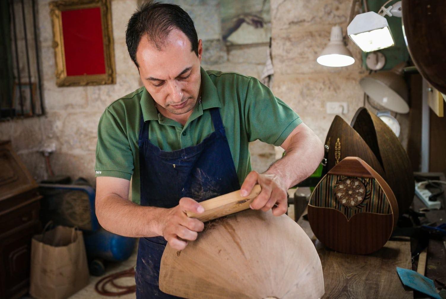 Ripara violini, viole e violoncelli mentre costruisce gli antichi strumenti, tutti a corda, della millenaria storia araba come l’oud, il tipico liuto a manico corto e con tre fori decorati, il più richiesto; il buzuq, a forma di lacrima e con tre coppie di corde; il kanun, una cetra trapezoidale a 78 corde pizzicate tramite due grossi plettri di corno. «È rifiorito l’interesse per le nostre radici musicali, in media la mia produzione mensile è di una decina di pezzi anche perché nell’ultimo periodo è aumentato il numero di musicisti miei connazionali». Uno dei suoi obiettivi è «creare l’oud palestinese, ma questo lavoro richiede molti anni per mettere in mostra la cultura unica della Palestina. È anche necessaria una collaborazione tra musicisti e artigiani per affermare la nostra identità».
