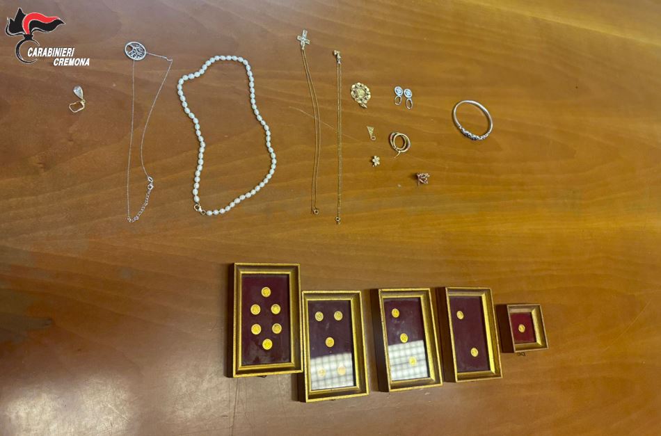 Nel frattempo, una pattuglia dell’Arma ha raggiunto l’abitazione della vittima, poi accompagnata in caserma a Crema per la denuncia. La donna ha riconosciuto parte dei preziosi recuperati: tutti i suoi beni, del valore stimato in circa 60mila euro, le sono stati immediatamente restituiti. Gli altri oggetti, del valore di 20mila euro, presumibilmente provento di un analogo reato non ancora emerso, sono stati sequestrati.