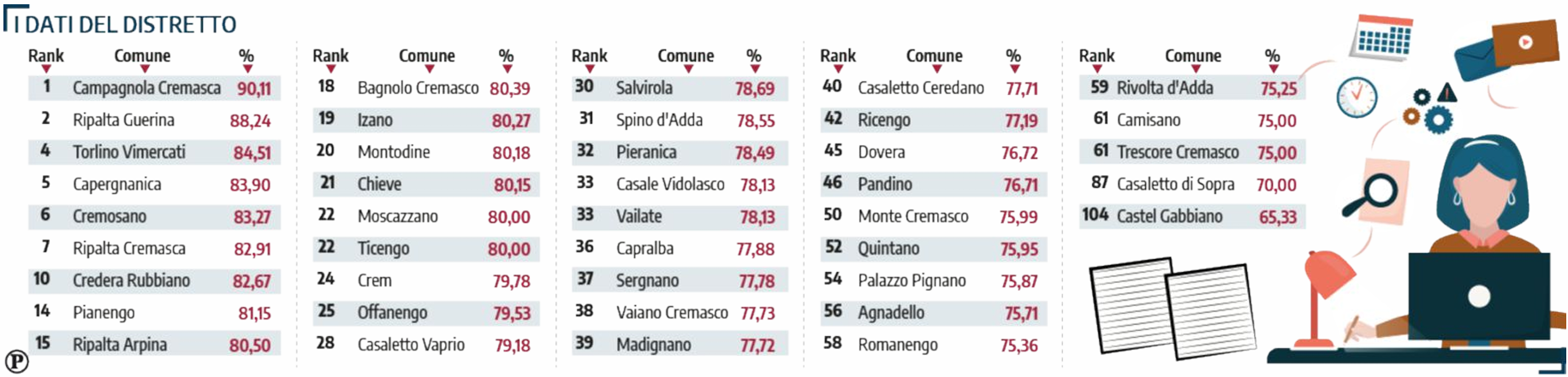 Subito dietro, una costellazione di comuni che parlano lo stesso dialetto economico: sette su dieci nella top ten provinciale sono racchiusi proprio nell’Area omogenea che si sviluppa attorno a Crema. Il capoluogo del distretto non resta a guardare: 79,78%, ben al di sopra di Cremona, che si ferma al 76,05%. Numeri che raccontano una geografia produttiva dove il lavoro femminile non è accessorio, ma struttura portante.