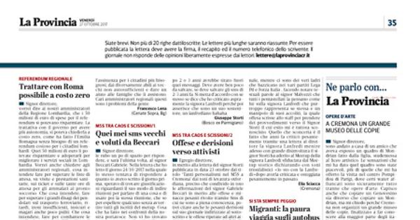 in merito alla lettera del signor Storti pubblicata in data 23 ottobre dal titolo ‘Tanti personalismi nel M5S a Cremona’ dai toni di levatura oxfordiana, preciso che condivido in toto le affermazioni del signor Gabriele Beccari in merito alle offese e minacce pesanti rivolte tramite Sms di cui ne sono a piena conoscenza, potrei citare anche le pesanti derisioni sul suo giornale indirizzate al sottoscritto e le offese ripetute ad altri attivisti sui meetup gestiti dai 5 Stelle dai quali è stato eliminato più volte, ma penso che non sia necessario oramai penso che tutti abbiamo compreso la personalità del soggetto, ricordo che tempo fa il signor Storti traendo spunto da un fatto di cronaca in occasione di un episodio che vide la condanna di un cittadino per avere rubato merce di scarso valore, prese le difese del soggetto condannato e dichiarò al suo giornale, mentre ci sono dei veri ladri che bazzicano nei vari partiti Lega Pd e Forza Italia , facendo notare testuali parole al signor Malvezzi che tutti i pentastellati la pensano come lui sulla signora Lanfredi che purtroppo rappresenta se stessa e un manipolo di suoi accoliti, la quale offesa scrisse allo staff per prendere dei provvedimenti verso il Signor Storti il cui esito mi è tuttora sconosciuto. Quello che sconcerta è il fatto che anni fa criticò pesantemente tramite una lettera al direttore la signora Lanfredi mentre adesso con grande disinvoltura il signor Storti ha aderito al Meetup della signora Lanfredi sfiduciata dal Meetup storico dichiarando con toni trionfalistici «Io sto con la Lanfredi»dopo averla criticata e osteggiata pesantemente in passato.