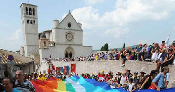 ASSISI - E' partita la Marcia della Pace Perugia-Assisi. In testa una grande bandiera con i colori dell'iride. "Cento anni di guerre bastano", è il tema scelto per questa edizione. Presenti molti gonfaloni degli enti locali,la presidente della Regione Umbria Marini,la vice presidente della Camera, Sereni, il sindaco di Perugia, Romizi, e altre autorità. La partenza è stata preceduta dal suono di 100 esplosioni. Ad attendere i marciatori ad Assisi, ci sarà anche la presidente della Camera, Boldrini.