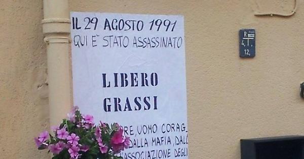 PALERMO (29 agosto 2020) - La vernice rosso sangue a ricordare la pozza in cui fu trovato Libero Grassi, l'imprenditore ucciso dalla mafia 29 anni fa perché non volle piegarsi al racket. E' Alice Grassi, con il fratello Davide, con la bomboletta spray per 'rinfrescare' il sangue versato dal padre, a perenne monito dei palermitani e non solo. Presenti, tra gli altri il prefetto di Palermo, Giuseppe Forlani, il questore Renato Cortese, i vertici di carabinieri e Guardia di finanza, il sindaco di Palermo, Leoluca Orlando. (ANSA)