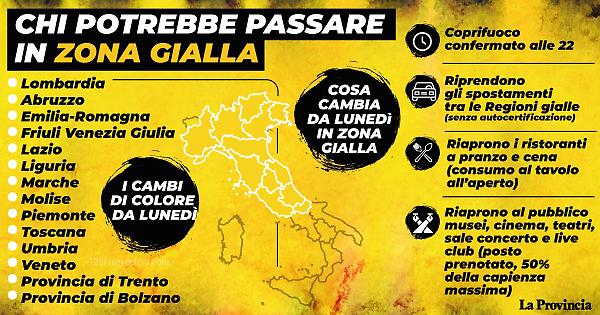 ROMA (22 aprile 2021) - Il calendario per il Paese è ormai deciso: si ripartirà lunedì prossimo, 26 aprile, e tra i primi a farlo saranno i ristoratori: in zona gialla, fino a tutto il mese di maggio, sarà possibile pranzare o cenare solo nei locali che hanno tavoli all’aperto e dal primo giugno si mangia nei ristoranti al chiuso solo a pranzo. Contemporaneamente - sempre in area gialla - riapriranno con specifici protocolli teatri, cinema e spettacoli e i musei. Dal 15 maggio sarà consentita l’attività nelle piscine scoperte. Anche se fin dall’entrata in vigore del decreto saranno possibili gli sport all’aria aperta, sarà permesso frequentare le palestre al chiuso in zona gialla soltanto dal primo giugno, data in cui saranno aperte al pubblico anche le manifestazioni e gli eventi sportivi di interesse nazionale. Ma sarà possibile autorizzare lo svolgimento di eventi sportivi di particolare rilevanza anche prima, con l’eventuale possibilità di una deroga al numero massimo di spettatori, che è fissato a mille per le strutture all’aperto. Il 15 giugno ripartono le fiere e dal primo luglio sarà la volta do congressi e parchi tematici. Parallelamente, i ragazzi tornano in classe. Fin dal 26 aprile in zona gialla e arancione tutti i ragazzi delle medie ed elementari saranno tra i banchi, in quelle superiori la presenza sarà almeno al 70% e fino al 100%. In zona rossa tutti presenti fino alla terza media, mentre alle superiori l’attività in classe si svolgerà almeno al 50%. Riguardo agli spostamenti, l’autocertificazione resta necessaria, laddove è già prevista, ma da subito gli italiani potranno girare più liberamente - anche tra regioni di colori diversi - avendo in tasca il certificato verde, che dovrà attestare la vaccinazione, l’esecuzione di un tampone negativo o l'avvenuta guarigione dal Covid. Chi avrà il pass potrà anche accedere a determinati eventi - culturali e sportivi. A stabilire quali saranno i territori che beneficeranno per primi delle nuove aperture sarà innanzitutto il monitoraggio di venerdì. Stando ai dati attuali, sono undici - Abruzzo, Emilia Romagna, Friuli Venezia Giulia, Lazio, Liguria, Lombardia, Marche, Molise, Piemonte, Umbria e Veneto - oltre alle province di Trento e Bolzano a puntare alla zona gialla, avendo un Rt nel valore inferiore sotto l’1 e un rischio basso o moderato, compatibile con uno 'scenario 1'. In zona arancione resterebbero invece Calabria, Sicilia, Basilicata, Campania e Toscana, che hanno un Rt vicino a 1 e un’incidenza sopra 200. Niente da fare per Puglia, Sardegna e Valle d’Aosta: hanno ancora numeri da rosso e per loro si parlerà di riaperture non prima di maggio. Infine i dati di oggi confermano il lieve calo dei contagi: 13.844 positivi e 364 vittime. (ANSA)