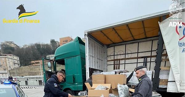 ANCONA - I militari del Comando Provinciale di Ancona, insieme ai funzionari dell'Ufficio delle Dogane di Ancona, hanno portato a termine con successo un'importante operazione, denominata "Porto di mezzo", finalizzata a prevenire e contrastare i traffici illeciti di sostanze stupefacenti nel Porto di Ancona. Grazie ad una accurata analisi di rischio condotta su scala europea, è stato possibile sequestrare oltre 163 kg di droga che un cittadino con passaporto comunitario aveva nascosto a bordo del suo camion, in procinto di imbarcarsi nel porto dorico. Durante un controllo effettuato su merce "sensibile", le Fiamme Gialle e i funzionari ADM hanno notato incongruenze nei documenti di trasporto e hanno deciso di effettuare un'ispezione più accurata dell'autoarticolato; ciò ha portato alla scoperta di numerosi scatoloni, abilmente nascosti nella parte anteriore di un rimorchio, dietro un carico apparentemente innocuo. All'interno degli stessi sono state rinvenute numerose buste di cellophane nero contenenti oltre 161 kg di marijuana ad alta concentrazione di THC e più di 2 kg di metanfetamina chimicamente trattata. Le sostanze, immediatamente sequestrate, una volta immesse sul mercato clandestino, avrebbero generato guadagni per diversi milioni di euro. L'operazione ha portato all'arresto in flagranza di reato di un trentacinquenne cittadino comunitario, accusato di traffico internazionale di stupefacenti. -foto Gdf e Adm - . tvi/mgg/com 30-Apr-25 12:37