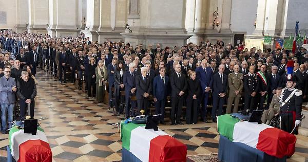 ROMA - Tutte le più alte cariche dello Stato hanno partecipato nel pomeriggio alle esequie dei tre carabinieri morti nell'esplosione del casolare a Castel D'Azzano nel veronese, il sottotenente Marco Piffari, del maresciallo Valerio Daprà e dell'appuntato Davide Bernardello. Nella basilica di Santa Giustina a Padova erano infatti presenti, tra gli altri, il presidente della Repubblica, Sergio Mattarella; il presidente del Senato, Ignazio La Russa; il presidente della Camera, Lorenzo Fontana; la premier, Giorgia Meloni, e i due vicepremier Antonio Tajani e Matteo Salvini. Nel suo intrervento, il ministro della Difesa Guido Crosetto ha sottolineato come "l'Italia intera si raccoglie nel dolore, rendendo omaggio a tre uomini dell'Arma. So che non ci sono parole per consolare, nulla che possa colmare il vuoto che lasciano Marco, Valerio e Davide. Ma una promessa posso farla: i nostri nomi sono scritti sulla sabbia della memoria di chi ci vuole bene, e con il tempo svaniranno. Il nome dei giusti, invece, di chi ha dato la vita per la Patria, è scritto nella roccia della memoria della Repubblica. Le forze armate sono custodi di quella memoria. E tra molti anni, quando nessuno di noi sarà presente, ci sarà lo Stato a rendere onore". Monsignor Gian Franco Saba, ordinario militare per l'Italia, nel corso dei funerali ha detto: "E' una grande famiglia che si ritrova qui per salutare Marco, Valerio e Davide. Ci stringiamo alla grande famiglia dell'Arma, ci stringiamo a voi cari familiari perché possiate sentire l'abbraccio di tutti e la preghiera unanime. Ci stringiamo a tutti coloro che sono stati feriti nel tragico evento. È dolorosamente e umanamente incompressibile il drammatico evento. Questi nostri cari fratelli, proprio mentre celebravano il loro servizio per il bene comune, hanno sperimentato la convivialità del male". Il padre di Davide Bernardello ha ricordato il figlio diventato un carabiniere "per realizzare uno dei più grandi sogni della tua vita. Eri limpido, sincero, generoso e sempre pronto ad aiutare". Il figlio di Valerio Daprà, visibilmente commosso e con voce rotta, ha detto. "Mio padre ha scelto una strada fatta di coraggio sacrificio e responsabilità, per lui era importante quel senso di responsabilità che era costantemente presente in lui, insieme alla pacatezza. Anche se questa insensata tragedia lo ha strappato a me e all'affetto di tutti coloro che lo hanno amato, voglio credere che la sua eredità morale continui a parlarmi anche nel silenzio". Il fratello di marco Piffari ha infine voluto fare un appello: "Il loro sacrificio non sia vano. Chiedo a tutti di stringersi ai nostri militari che operano in Italia e all'estero, ai carabinieri dico grazie per ciò che fate tutti i giorni, avete dato dimostrazioni importanti anche a noi familiari". Al termine della funzione i feretri sono stati salutati con un lunghissimo applauso dalle tante persone che hanno gremito la piazza antistante la basilica. Avvolti nel Tricolore e portati a spalla dai loro colleghi in divisa, sono stati accompagnati dagli onori militari. . -Foto: Quirinale- ads/r 17-Ott-25 19:24