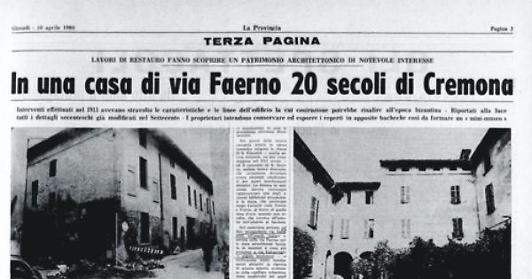 Via Gabriele Faerno fino al secolo scorso si chiamò « Contrada della carità » e l'attuale via Felice Geromini nella carta di Cremona del Campi è indicata come ''Strada rubra''. cioè rossa, denominazione che mantenne fino a tutto il secolo XVIII. Lo stabile di cui ci occupiamo comprende la parte estremaa di un isolalo delimitato dalle vie Geromini, Faerno e Valcarenghi. Nello stabile in questione è in corso da parecchi mesi un cantiere che sta provvedendo a ristrutturare l'edificio per uso abitativo, ma tale intervento, per la prima volta a Cremona, è stato concepito secondo criteri del tutto nuovi e con metodologie altrettanto nuove determinate dall'essere lo stabile un autentico spaccato di storia e di architettura locale con caratteristiche di tutto rilievo (...)