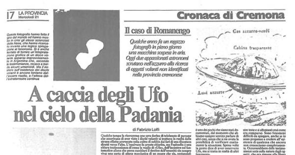 (...) Gli avvistamenti sono per lo più casuali, ma esiste anche un gruppo organizzato di queste sentinelle del cielo, formato per il momento da due amici che si dilettano di astronomia, ma che raccolgono anche notizie su gli «incontri ravvicinati del primo tipo» verificatisi in questi anni nel cremonese. Giancarlo Pandini e Maurizio Bonetti risiedono a Trescore Cremasco e costituiscono il primo nucleo di pionieri che, muniti di macchina fotografica e telescopio, scrutano durante le sere la volta stellata, osservando i pianeti, ma interessandosi a tutto ciò che brilla e che non ha avuto ancora adesso una adeguata spiegazione scientifica. Logico che sia nata anche la passione per gli Ufo, un dilemma che sembra ossessionare l'umanità intera fin dal 1947 (...)