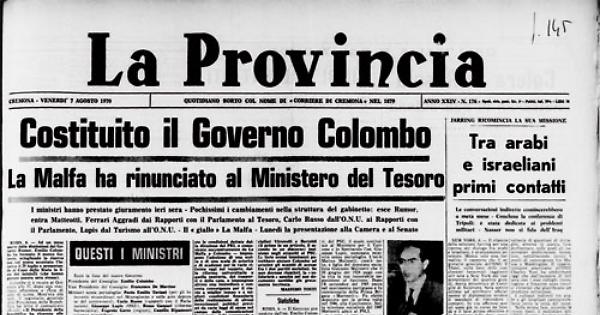 Costituito il Governo Colombo - La Malfa ha rinunciato al Ministero del Tesoro. I ministri hanno prestato giuramento ieri sera - Pochissimi i cambiamenti nella struttura del gabinetto: esce Rumor, entra Matteotti. Ferrari Aggradi dai Rapporti con il Parlamento al Tesoro, Carlo Russo dall'O.N.U. ai Rapporti con il Parlamento, Lupis dal Turismo all'O.N.U. - Il « giallo » La Malfa - Lunedì la presentazione alla Camera e al Senato.