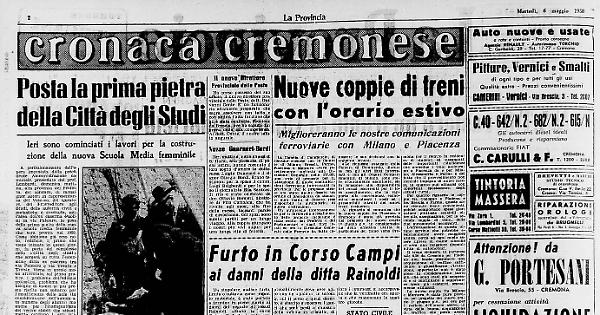 A perfezionamento dell'opera impostata dalla precedente Amministrazione comunale, presieduta dal prof. Lombardi, domenica mattina, alla presenza del Prefetto, del sindaco, di monsignor Astori in rappresentanza del Vescovo, del Questore, del Provveditore agli Studi, delle autorità civili e scolastiche è avvenuta, nell'area dell'ex caserma Paolini in via Palestro, la posa della prima pietra della nuova scuola media femminile che sarà pronta nel 1959.