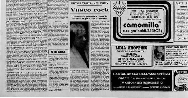 Buon successo di pubblico al Cellophane per assistere all’atipico concerto-recital di Vasco Rossi, uno dei più stravaganti cantautori dell’area rock che annoveriamo. Dalla voce roca e gracchiante Vasco Rossi non ha avuto molto spazio per poter esprimersi al meglio in alcuni numeri di «quasi-follia», però ha concretizzato quel suo rock a tratti duro e umoristico, a tratti beffeggiante ed irridente, che lo ha fatto notare al grosso pubblico.