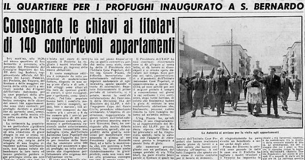Ieri mattina, alle 10,30, nel nuovo quartiere di San Bernardo è avvenuta, alla presenza del Presidente dei Consiglio Superiore dei LL. PP. dott. ing. Scalessi, rappresentante ufficiale del Ministro dei Lavori Pubblici, del Prefetto, del Vescovo, del Sindaco e delle maggiori autorità della città civili e militari nonché dei dirigenti dell'Istituto Autonomo per le case popolari della provincia di Cremona, la simbolica consegna delle chiavi dei nuovi 140 appartamenti che sono stati costruiti per profughi dalmati e giuliani che da parecchi anni, ormai, sono ospiti della nostra città nella caserma di via Villa Glori.