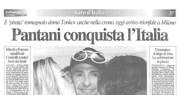 Pavel Tonkov, lo sconfitto, non l'ha presa bene. In un perfido comunicato dichiara: «Non sono deluso dalla mia prestazione, semmai esprimo sorpresa per quella di Pantani. Non pensavo davvero che la 'carica' attribuita alla maglia rosa permettesse ad uno scalatore di volare come un cronoman». Il veleno è in quella parola tra virgolette: 'carica' evoca lo spettro dell'epo, già richiamato al mattino dai 'vampiri' dell'Uci che escludono dal Giro Miceli e Forconi.