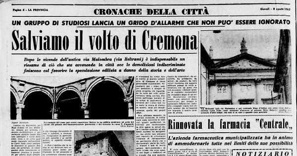 Esiste indubbiamente una caotica legislazione in materia che consente le più ampie ed impunite speculazioni in materia edilizia; ma dovrebbero essere presenti, e le autorità e gli enti culturali, ogni qualvolta si tratta di intervenire per salvare un patrimonio che è di tutti e che appartiene alla città nella sua interezza, spirituale ed architettonica, storica e religiosa. Cremona non può essere lasciata alla mercè dei barbari di nuovo conio e bisogna fermare l'andazzo più o meno legalizzato che sta deturpando anche i simboli più gloriosi del nostro passato. Ci associamo quindi alla lettera accorata di questo gruppo di studiosi che sanno difendere Cremona in nome di quanti hanno a cuore la nostra storia: che è fatta anche delle cose egregie realizzate da intarsiatori, da architetti, da arredatori, da pittori, da scultori, da tutti coloro insomma che seppero edificare palazzi di civile abitazione con un gusto che non possiamo rifiutare alme no se vogliamo comportarci da cremonesi degni di tal nome.