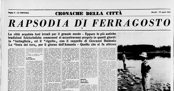 La città acquista toni irreali per il grande esodo - Eppure le più antiche tradizioni folcloristiche cremonesi si accentravano proprio in questi giorni: la “battagliola„ ed il "rigotto,, con il cappello di Giovanni Baldesio La "festa del toro,, per il giorno dell'Assunta - Quello che si fa altrove