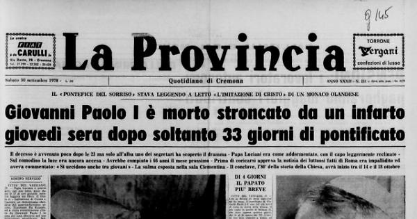 Il decesso è avvenuto poco dopo le 23 ma solo all'alba uno dei secretali ha scoperto il dramma - Papa Luciani era come addormentato, con il capo leggermente reclinato - Sul comodino la luce era ancora accesa - Avrebbe compiuto i 66 anni il mese prossimo - Prima di coricarsi appresa la notizia dei luttuosi fatti di Roma era impallidito ed aveva commentato: « Si uccidono anche tra giovani » - La salma esposta nella sala Clementina - Il conclave, l’80° della storia della Chiesa, avrà inizio tra il 14 e il 18 ottobre