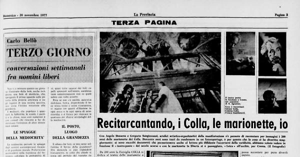 Con Angelo Dossena e Gregorio Sangiovanni, artefici artistico-organizzativi della manifestazione s'è pensato di raccontare per Immagini i 200 anni delle marionette dei Colla. Duecento anni sono tanti da condensare in un fotoreportage, è per questo che la cosa ci ha divertito maggiormente; si sono raccolti documenti che permettessero anche al lettore più diffidente l'accertarsi della veridicità, abbiamo voluto vedere in funzione il «teatro-ponte» del secolo scorso e con le marionette in libertà si è passeggiato, «Leica» all'occhio, per Crema. (Il fotografo)