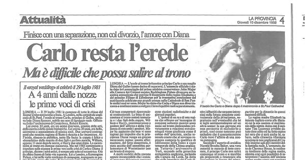 Ciò non comporterà ripercussioni costituzionali. La linea di successione al trono resterà immutata e i due figli della coppia, William e Harry, continueranno a godere dell' affetto e della vicinanza di entrambi i genitori. Major ha aggiunto che non vi sono ragioni per impedire che la principessa Diana venga un giorno incoronata regina: questa affermazione, del tutto inaspettata, è stata accolta dall'assemblea parlamentare di Westminster con un brusio di stupore.