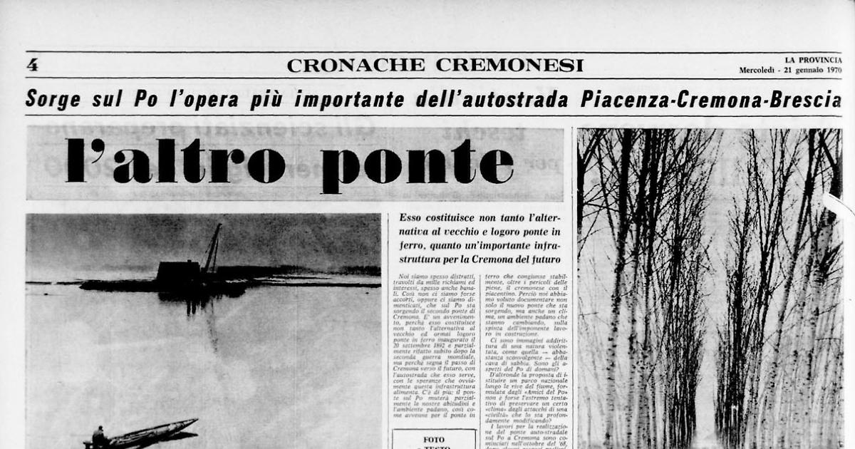 Noi siamo spesso distratti, travolti da mille richiami ed interessi, spesso anche banali. Così non ci siamo forse accolti, oppure ci siamo dimenticati, che sul Po sta sorgendo il secondo ponte di Cremona. E' un avvenimento, perchè esso costituisce non tanto l'alternativa al vecchio ed ormai logoro ponte in ferro inaugurato il 20 settembre 1892 e parzialmente rifatto subito dopo la seconda guerra mondiale, ma perchè segna il passo di Cremona verso il futuro, con l'autostrada che esso serve, con le speranze che ovviamente questa infrastruttura alimenta. C'è di più: il ponte sul Po muterà parzialmente le nostre abitudini e l'ambiente padano, così come avvenne per il ponte in ferro che congiunse stabilmente, oltre i pericoli delle piene, il cremonese con il piacentino. Perciò noi abbiamo voluto documentare non solo il nuovo ponte che sta sorgendo, ma anche un clima, un ambiente padano che stanno cambiando, sulla spinta dell'imponente lavoro in costruzione.