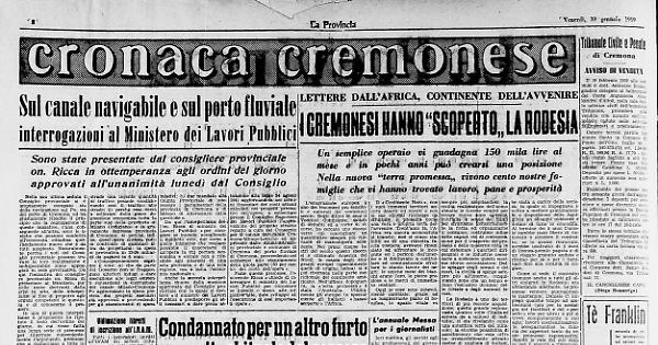 La Rodesia è uno dei territori di più recente acquisizione; questa grande regione, vasta quattro volte l'Italia ed abitata da 4 milioni di individui, si sta rivelando come una autentica terra del miracolo; la enorme possibilità di assorbimento che essa offre ha irresistibilmente attratto decine di migliaia di italiani, impiegati poi nei più differenti lavori, gran parte di essi lavorano alla grande diga (sarà una delle più capaci del mondo) che si sta edificando sul corso del fiume Zambesi; altri, sono occupati in officine per la costruzione di macchine agricole; altri ancora vengono impiegati nell'approntamento della rete ferroviaria che collegherà le più importanti città che stanno sorgendo od ampliandosi un poco in ogni dove. Attualmente la Rodesia ospita anche un centinaio di famiglie cremonesi provenienti da Rivolta d'Adda, Pandino, Trescore Cremasco, Spino d'Adda, Pizzighettone, Soncino, Castelverde, Camisano, Bordolano, Casalmaggiore, Robecco d'Oglio, Piadena, Gussola e da altre località minori.