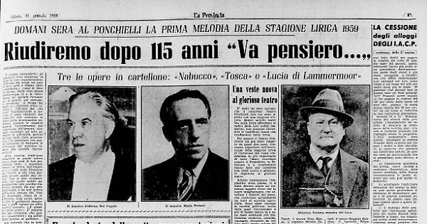 Il «Nabucco» con il quale domenica sera sarà inaugurata la stagione lirica, per coloro che non si recano in altre città per assistere a spettacoli lirici, si può considerare opera nuovissima, a parte, naturalmente, le sue vecchie caratteristiche musicali. Sembra infatti che quest'opera sia stata rappresentata al Ponchielli una volta sola, nel febbraio 1844, due anni dopo la prima assoluta alla Scala. Sarebbero dunque 115 anni che quest'opera non torna sui- nostri palcoscenici.
