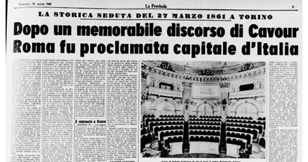 Il 27 marzo 1861, dopo uno dei più memorabili discorsi di Cavour, la Camera riunita in palazzo Carignano a Torino proclamava Roma capitale d'Italia.