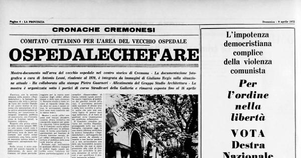 Continua, con la seconda edizione della mostra «Ospedalechefare» la battaglia democratica che mira a sottrarre l'area del vecchio Ospedale nel centro storico di Cremona alla speculazione ed alla cattiva amministrazione urbanistica, per conservarne la integrale proprietà pubblica ed assicurarne, con l'introduzione di funzioni sociali, la fruizione collettiva.