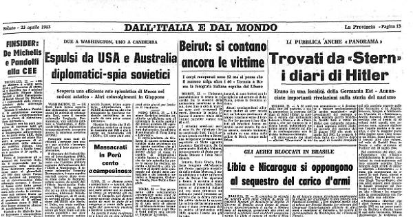 L'autenticità degli scritti di Hitler — afferma «Panorama» — è stata già comprovata da esperti di vari Paesi, storici e specialisti. Fra questi lo storico Hugh Trevor-Hoper, riferisce che i diari furono caricati il 21 aprile 1945 su un aereo partito da Berlino e diretto verso il sud della Germania. Ultima destinazione: la residenza di Hitler a Berchtesgaden, dove il Fuehrer contava di mettere in salvo questo e altro materiale. Ma il trimotore, appartenente alla flotta personale di Hitler, precipitò, forse abbattuto, nei pressi del villaggio di Boernersdorf, nel territorio dell'attuale Repubblica Democratica Tedesca.