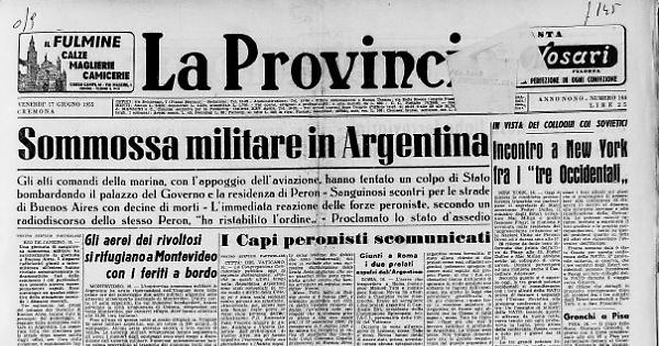 Gli alti comandi della marina, con l'appoggio dell'aviazione, hanno tentato un colpo di Stato bombardando il palazzo del Governo e la residenza di Peron - Sanguinosi scontri per le strade di Buenos Aires con decine di morti - L'immediata reazione delle forze peroniste, secondo un radiodiscorso dello stesso Peron, "ha ristabilito l'ordine” - Proclamato lo stato d'assedio