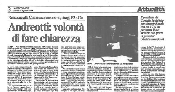 La novità sta invece proprio sulla polemica scatenatasi a proposito del caso «Cia-P2». Andreotti apre infatti l'argomento giudicando «un atteggiamento provocatorio veramente inusuale» la decisione del Tg1 di trasmettere, martedì sera, anche una nuova puntata dell'inchiesta sui presunti interventi della Cia in Europa. La parte centrale della sua relazione è dunque tutta dedicata a fornire nuove notizie sulla «credibilità» dell'inchiesta del Tg1.