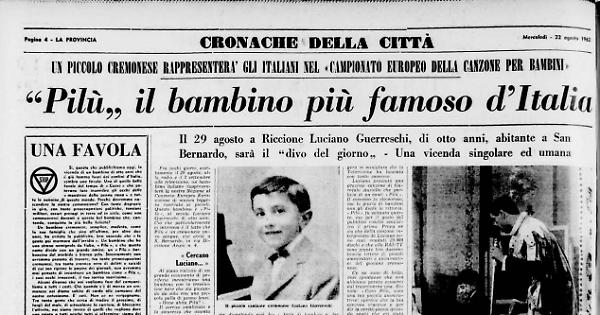 Fra pochi giorni, esattamente il 29 agosto, alla radio e il 2 settembre alla televisione, un bambino italiano rappresenterà la nostra Nazione al Concorso Europeo Eurovisione di musica leggera riservato ai piccoli. Questo bambino è «Pilù», al secolo Luciano Guerreschi di otto anni. Ciò che particolarmente ci interessa è il fatto che Pilù è un cremonese puro sangue, che abita a S. Bernardo, in via Divisione Acqui n. 4.