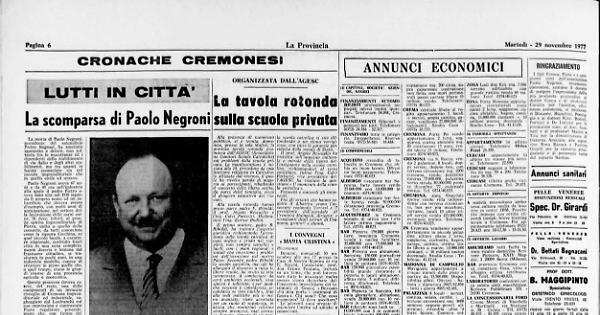 Paolo Negroni aveva 67 anni e da 45 era nell'industria alla quale il padre Pietro aveva dato vita nel 1910 legando il proprio nome ad un salumificio che doveva essere d'esempio, con molti anni di anticipazione, nel settore della lavorazione delle carni. Si deve, infatti, al grande spirito imprenditoriale di Pietro, unito a quello della consorte, la signora Cecchina, se quel piccolo locale a carattere stagionale, costruito fuori città in una zona completamente deserta e lontana dal frastuono cittadino, si trasformò in pochi anni in una industria modello, capace di sfruttare in pieno quelle che, a quel tempo, erano le grandi risorse di una provincia agricola e zootecnica.