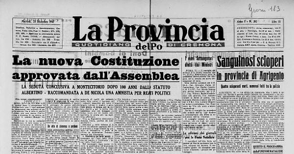 La Costituzione della Repubblica Italiana, è stata approvata con 453 voti favorevoli, 62 contrari su 515 deputati presenti e votanti. La Carta consta di 139 articoli contro gli 84 dello Statuto Albertino e all'esame di essa è stata destinata gran parte delle 347 sedute che si sono tenute all'Assemblea Costituente. Un vero primato, se si pensa che questo numero è stato raramente raggiunto anche nelle normali sessioni parlamentari di cinque anni. Ne fanno fede le 347 sedute, delle quali 289 di carattere costituzionale; 1663 emendamenti che furono presentali sugli articoli del progetto di costituzione, dei quali 292 approvati, 311 respinti, 1057 ritirati od assorbiti; i 1090 interventi in discussione da parte di 275 oratori; i 44 appelli nominali ed i 104 scrutini segreti; i 140 ordini del giorno votati; gli 828 schemi di provvedimenti legislativi trasmessi dal governo all'esame delle commissioni permanenti ed i 61 disegni di legge deferiti all'assemblea; le 23 mozioni presentate delle quali 7 svolte; le 166 interpellanze di cui 22 discusse; le 1408 interrogazioni, 492 delle quali trattate in seduta più 2161 con domanda di risposta scritta che furono soddisfatte per oltre tre quarti dai rispettivi dicasteri.