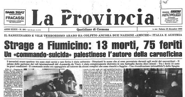 Un «commando-kamikaze» di palestinesi con bombe a mano e mitragliatori ha assaltato l'aeroporto Leonardo da Vinci uccidendo 13 persone e ferendone almeno settantacinque. Tre degli assassini sono caduti sotto i colpi della polizia italiana e degli agenti israeliani, (uno è stato ferito e catturato).