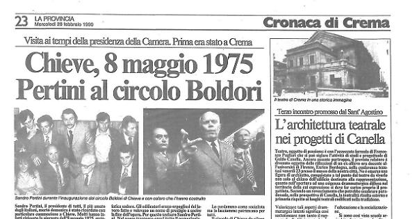 «1975 — il Circolo Attilio Boldori sarebbe stato inaugurato da Sandro Pertini: era una domenica dei primi di maggio. Il paese di Chieve si accingeva ad accogliere con trepidanza una tra le figure più nobili dell'antifascismo, la guida prestigiosa della lotta partigiana, il socialista che aveva salvato la vita di Filippo Turati.