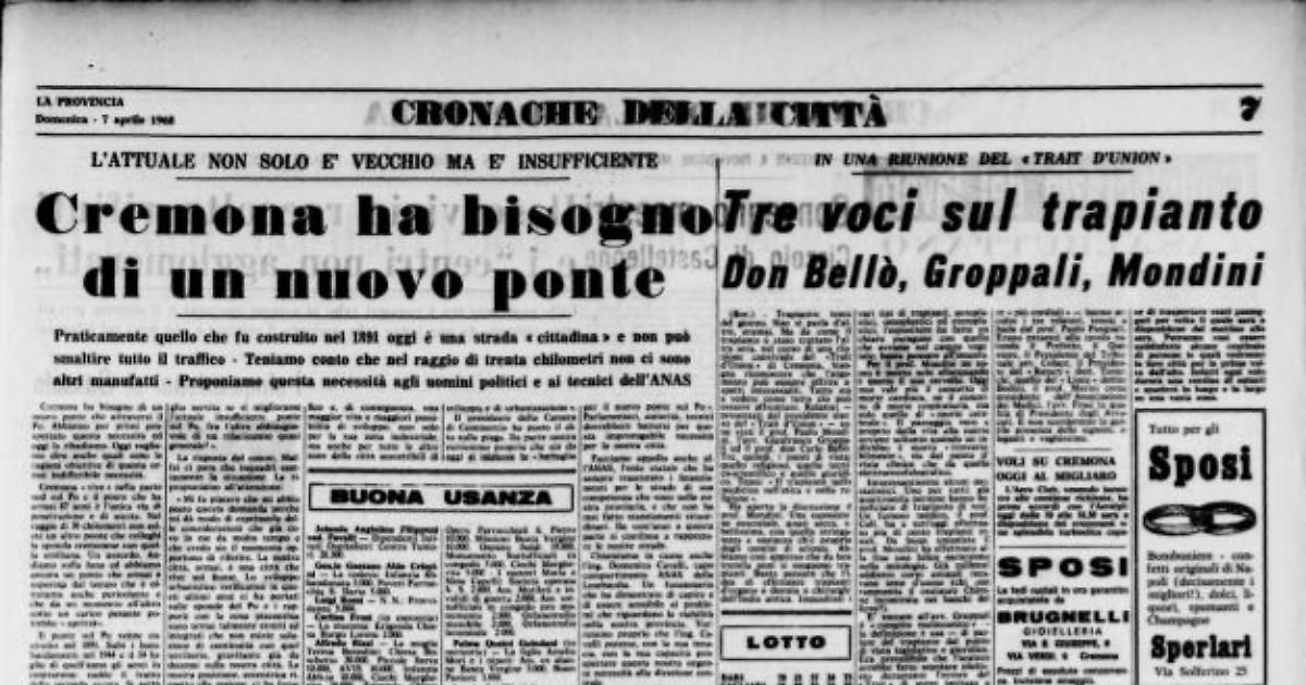 Cremona ha bisogno di un nuovo ponte che attraversi il Po. Abbiamo per primi prospettato questa necessità ed oggi la ribadiamo. Oggi vogliamo dire anche quali sono le ragioni obiettive di questa ormai indifferibile necessità. Cremona «vive» nella parte sud sul Po e il ponte che ha ormai 87 anni è l'unica via di penetrazione e di uscita. Nel raggio di 30 chilometri non esiste un altro ponte che colleghi la sponda cremonese con quella emiliana. Un assurdo. Andiamo sulla luna ed abbiamo ancora un ponte che ormai è superate dal tempo che è oltretutto anche pericolante e che da un momento all'altro sotto un carico pesante potrebbe «aprirsi».
