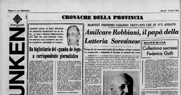 SORESINA. 7. — In questo mese di aprile, e precisamente il 13, cade il ventesimo anniversario della morte dell'ing. Amilcare Robbiani, emerito cittadino, che illustrò con la vita e le opere la sua città natale.