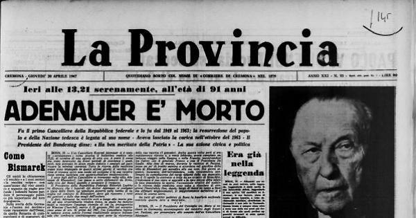 Il dott. Adenaeur ha resistito così a lungo alla morte grazie ad una straordinaria vitalità fisica, la quale ha indotto molti a ricordare l'analoga vicenda di cui fu protagonista sir Winston Churchill, morto il 24 gennaio 1965 nel novantesimo anno di età. Ai primi del 1967, l'ex Cancelliere federale tedesco aveva subito l'ormai tradizionale attacco influenzale che sembrava contrassegnare ogni anno la ricorrenza della sua nascita (5 gennaio). Anche questa volta però si era rapidamente ripreso e, a metà febbraio, aveva compiuto un faticoso viaggio nella Spagna e nella Francia, incontrandosi tra l'altro con il generale Franco e con il Presidente De Grulle. Alla fine di marzo, durante le vacanze di Pasqua, prese un po' di freddo mentre si attardava nel giardino della villa di Rhoendorf per accudire alle sue rose. Nei giorni seguenti, incurante dell'infreddatura, volle tenacemente continuare la compilazione del terzo volume delle sue memorie; ma il 12 aprile fu costretto a letto da un attacco di bronchite. L'indomani il suo stato si aggravò e la sera stessa ebbe inizio la fase precedente la morte; l'eccezionale vitalità del malato e le risorse della medicina sono valse a ritardare di otto giorni l'inevitabile fine, dando luogo di tanto in tanto a lievi ma effimeri miglioramenti. Il peggioramento definitivo si è avuto la scorsa notte.